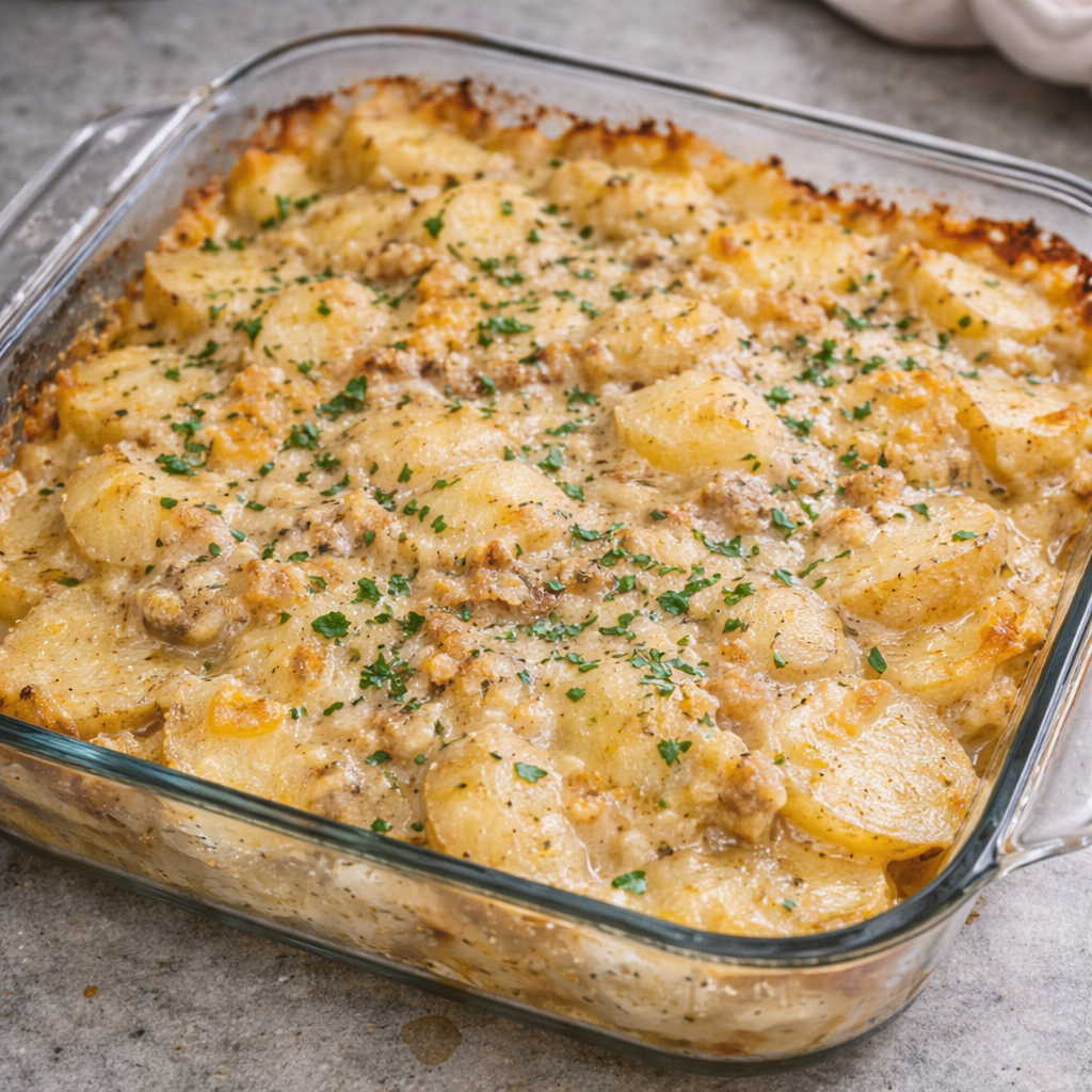 What makes this recipe so good is the combination of tender potatoes and that creamy seasoned sauce poured right over the top before baking. It soaks into every layer, turns beautifully golden, and gives you that soft, savory, deeply comforting texture that feels perfect for a cold evening.