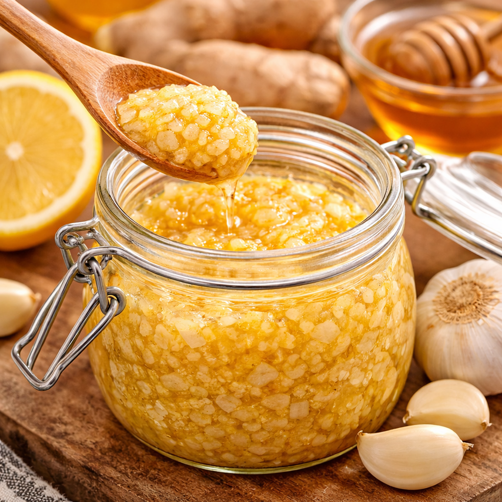 This kind of old-school kitchen recipe always gets attention because it uses ingredients people already know and usually already have at home. Ginger, garlic, onion, lemon juice, and honey make a strong, punchy mix with sweet, sharp, and earthy flavor all in one spoonful.