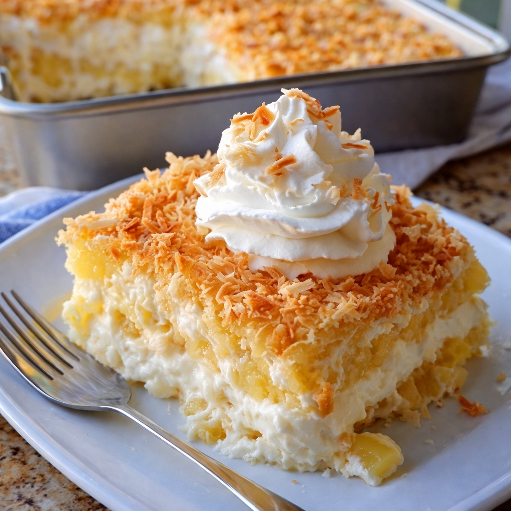 What makes this one so good is the mix of textures. You get soft cake or pudding-like layers, creamy filling, sweet pineapple flavor, and that golden toasted coconut on top that makes the whole thing feel extra special. It is the kind of dessert that tastes old-fashioned in the best possible way.