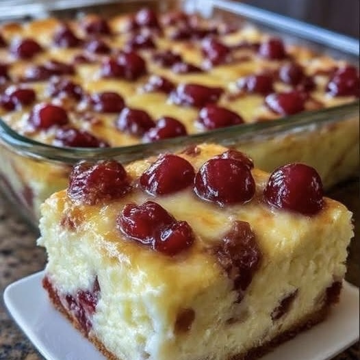 You get a soft cake layer, a creamy topping, and bright little cherries all over the top.