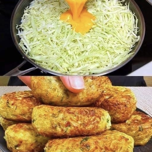 For the golden breakfast bites in the image, take portions of the cabbage and egg mixture and shape them into small logs or oval patties.