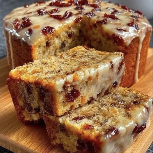 It is just a really good, rich loaf-style cake full of fruit, warmth, and that sweet glaze on top that makes the whole thing feel finished.