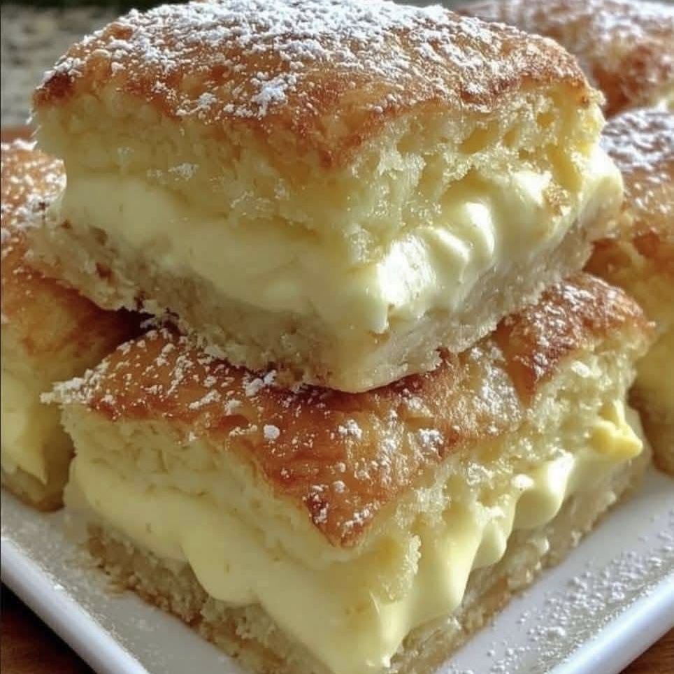 They are soft, light, lightly sweet, and packed with a rich creamy center that makes the whole thing feel much more special than a simple tray bake. The top turns golden, the middle stays smooth and luscious, and a little dusting of powdered sugar on top makes them look like something that came straight from a bakery case.