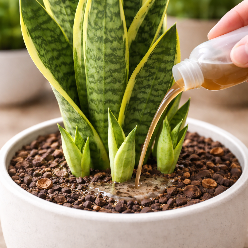 Just a mild, diluted compost tea used carefully around the base as part of a fuller snake plant care routine.