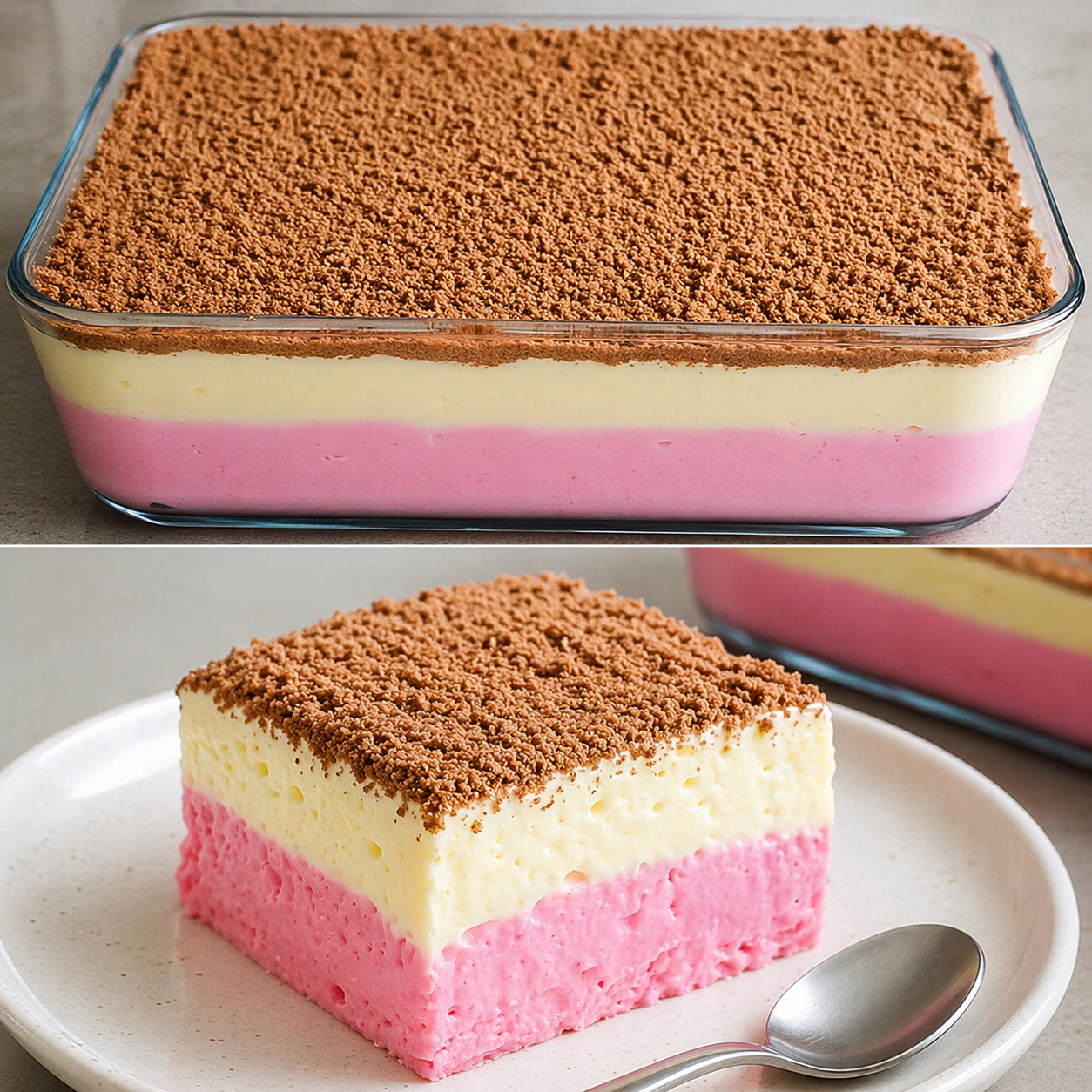 Together, the layers feel light, creamy, and spoonable, almost somewhere between a mousse dessert, a chilled pudding slice, and a soft no-bake cake filling.